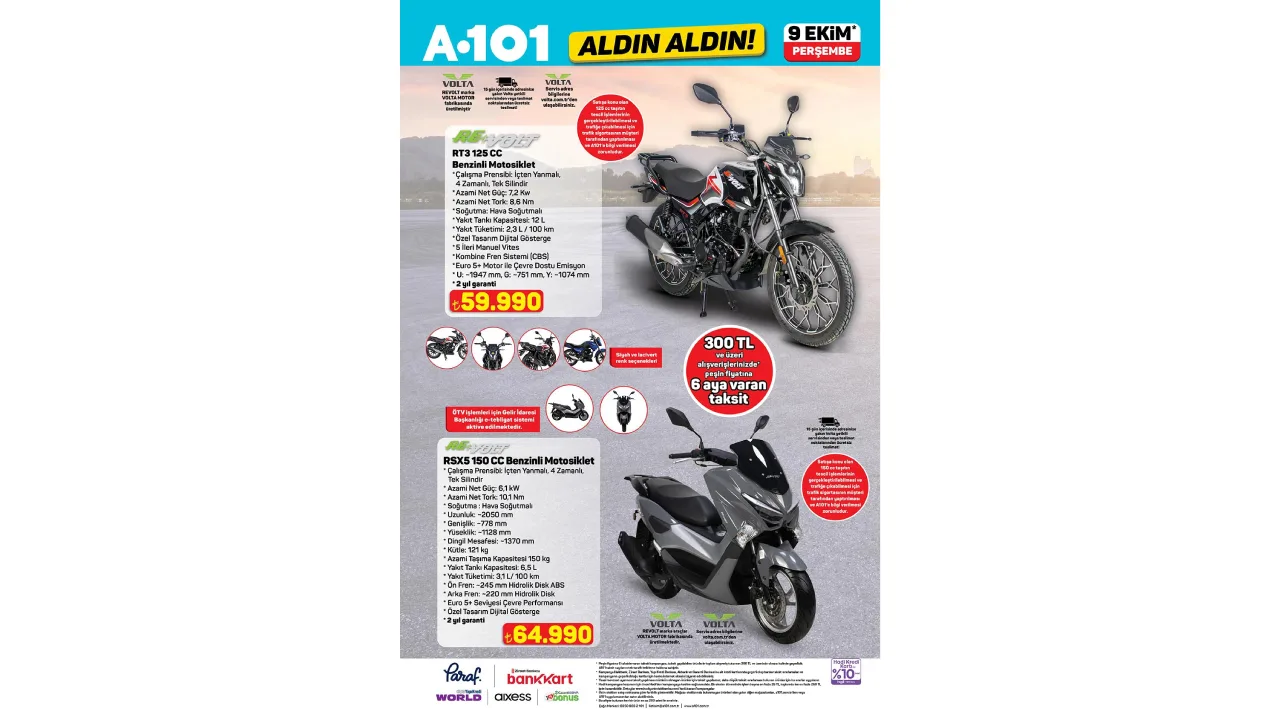 A101’in 9 Ekim tarihli Ekstra ürünleri arasında REVOLT RT3 125 CC benzinli motosiklet yer alıyor. 7,2 kW güç ve 8,6 Nm tork üreten motosikletin fiyatı ise 59.990 TL olarak belirlendi. Bununla birlikte, 6,1 kW güç ve 10,1 Nm tork üreten benzinli REVOLT RSX5 150 CC modelinin fiyatı 64.990 TL olarak açıklandı.