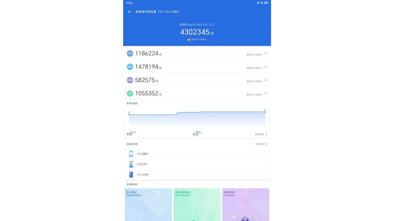 Yaklaşan Honor MagicPad 3 Pro modeli AnTuTu testlerinden 4.302.345 puan alarak rekor kırdı. Cihaz CPU testinden 1.186.224, GPU testinden 1.478.194, bellek testinden 582.575 ve kullanıcı deneyimi testinden 1.055.352 puan almayı başardı.