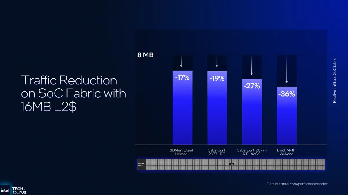 Şirket, daha büyük L2 önbelleğin grafik işlemcisini ana belleğe bağlayan Panther Lake’in paket içi yapısında trafiği azalttığını söylüyor. Yani RAM’e erişim için CPU ve NPU ile rekabet halinde olabilecek entegre bir grafik işlemcisi için önemli bir husus. Intel, 8 MB L2’ye sahip bir ürünü referans alarak yapı trafiğinde %17 ila %36 arasında azalma olduğunu iddia eden bir grafik gösterdi.