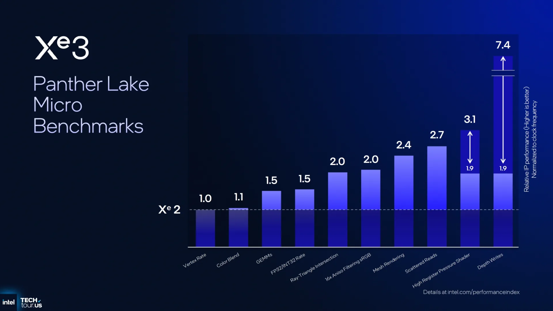 Şimdi gelelim son tüketicilerin doğrudan baktığı performans verilerine. Intel Xe3 Panther Lake Mikro Benchmark grafiği, çeşitli görevlerdeki performans iyileştirmelerini gösteriyor; en yüksek iyileştirme 7,4 ile Derinlik Yazma (Depth Writes) görevinde. GEMM’deki FP16 ölçümleri, GPU’nun ölçeğiyle orantılı olarak %50’lik bir iyileşme gösteriyor. Xe3, Xe2’den %50 daha büyük ve bu mikro benchmarklar mimarinin yeteneklerini tam olarak kullanabiliyor. Aradaki performans farkı da çip büyüklüğünden kaynaklanmakta. Anizotropik oran, Mesh Render oranı, Dağınık Okumalar ve R/T kesişimi gibi skorlar ise 2 kat ila 2,7 kat arasında iyileşme gösteriyor.