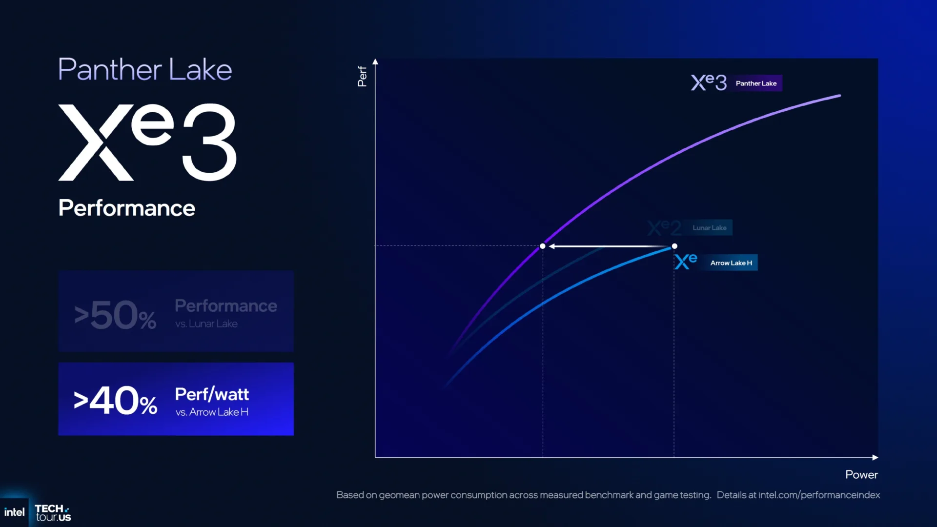 Panther Lake Xe3 ile yapılan Lunar Lake Xe2 ve Arrow Lake-H Xe+ kıyaslamalarına göz atalım. Xe3, en yüksek güçte Lunar Lake’e kıyasla %50’den fazla performans ve Arrow Lake-H’e kıyasla watt başına %40’tan fazla daha yüksek performansla çalışabiliyor.