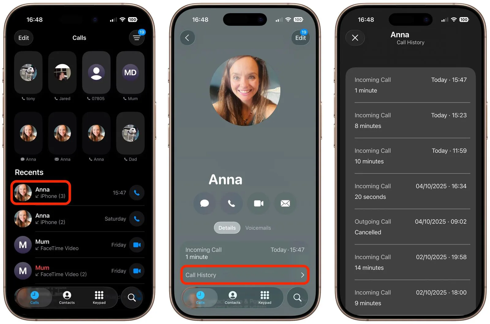 Kişiye özel tüm arama geçmişi ekranı iOS 26’da