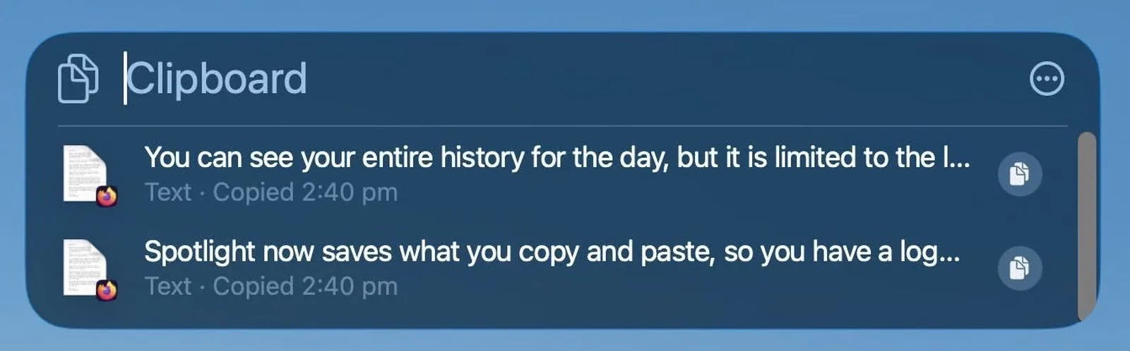 Spotlight artık pano geçmişini içeriyor ve kopyaladıklarınızı ve yapıştırdıklarınızı takip ediyor. Her sekiz saatte bir silindiği için uzun vadede hiçbir şey kaydedilmiyor, ancak günün erken saatlerinde kopyaladığınız bir şeyi bulmanız gerekiyorsa kullanışlı oluyor. Bu özellik, özellikle araştırma yapan, metin düzenleyen veya farklı kaynaklardan bilgi toplayan kullanıcılar için büyük bir nimet.