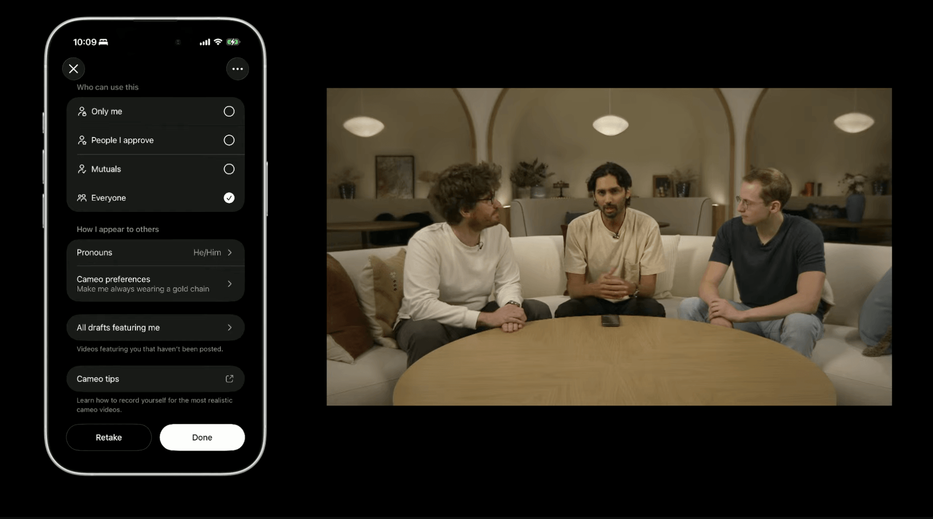 Sora’da benzerliğinizi baştan sona kontrol edebilirsiniz. Cameonuzu kimin kullanabileceğine sadece siz karar verirsiniz ve istediğiniz zaman erişimi iptal edebilir veya Cameonuzu içeren videoları kaldırabilirsiniz. Başkaları tarafından oluşturulan taslaklar da dahil olmak üzere, sizin Cameolarınızı içeren videoları istediğiniz zaman görüntüleyebilirsiniz.