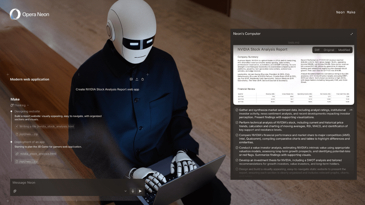 Opera, yapay zeka odaklı yeni tarayıcısı Neon’u kullanıma sundu. Neon, web’de gezinmenin ötesine geçerek kullanıcıların yanında hareket eden bir yapay zeka destekli ajan sunuyor. Tarayıcı, görevleri yerine getirebiliyor, kod yazabiliyor ve sonuçları doğrudan tarayıcı arayüzünde sunabiliyor.