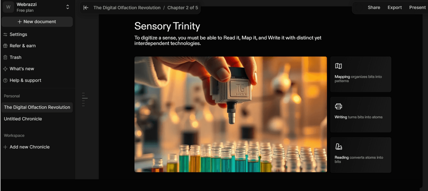 Chronicle, sunum hazırlama sürecini baştan sona dönüştüren bir girişim olarak öne çıkıyor. Platform, kullanıcıların yalnızca düşüncelerini ve kaba taslaklarını girmesiyle profesyonel görünümlü sunumlar oluşturmasına imkan veriyor. Tasarım becerisi gerektirmeden etkileyici slaytlar hazırlanabiliyor ve bu süreç, yapay zeka destekli otomasyon sayesinde hem hızlanıyor hem de kolaylaşıyor. Özellikle hızlı hareket eden ve iş birliği içinde çalışan ekipler için tasarlanan Chronicle, iş dünyasında iş odaklı kullanım senaryolarına yanıt verirken aynı zamanda eğlenceli bir deneyim sunuyor.